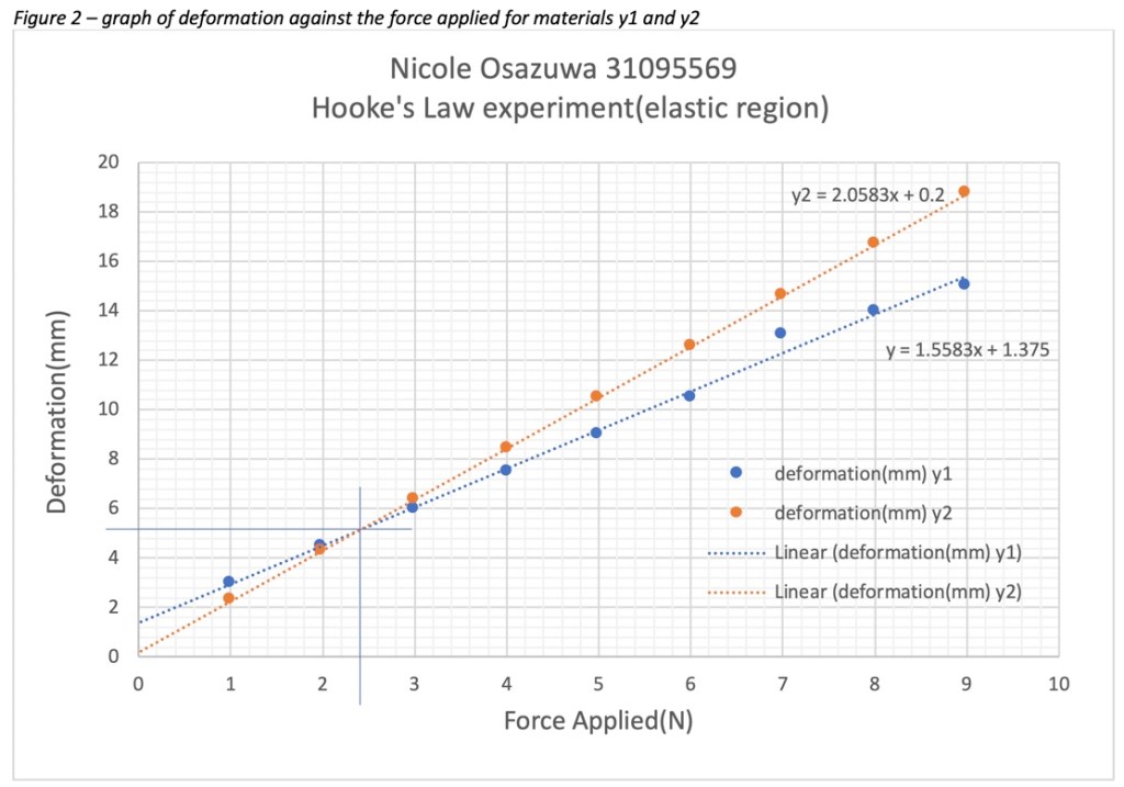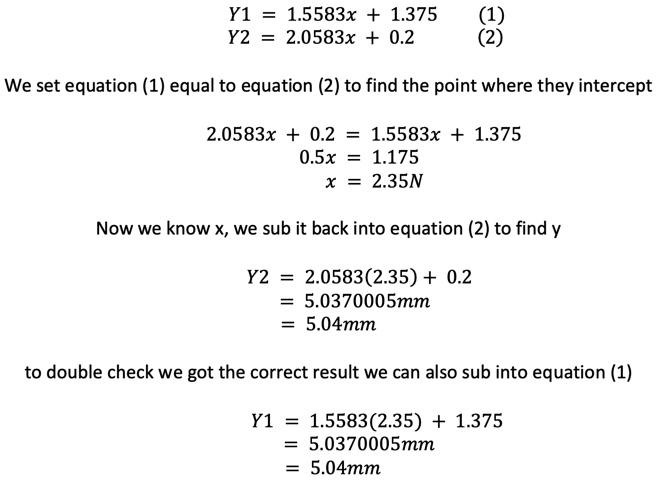 However, this error has had an interesting effect on the graph. As the trendline of y1 misses the origin by quite a large margin, there is a point shown where the trendlines intercept each other which is not theoretically possible. This point is marked by the intercepting blue lines. So according to the graph, to get a deformation of around 5mm both materials need the force applied to be around 2.4N. This can be checked using simultaneous equations which I will demonstrate below.