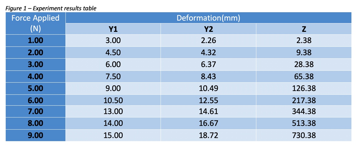 Figure 1 above is the results table that I obtained from the experiment. The labels Y1, Y2, and Z refer to the three different materials used. The load on each material was varied and the deformation was recorded.