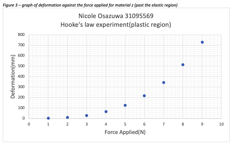 Figure three above displays the deformation against the force applied for material z and it is easy to see that the material has passed its elastic limit. The non-linear shape of the graph shows that Hooke’s law no longer applies for this material. The graph is actually much closer to being exponential.